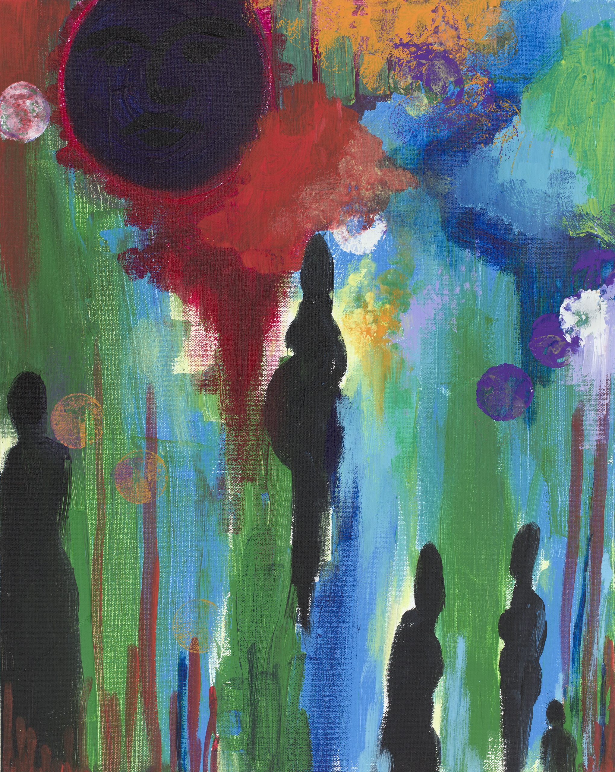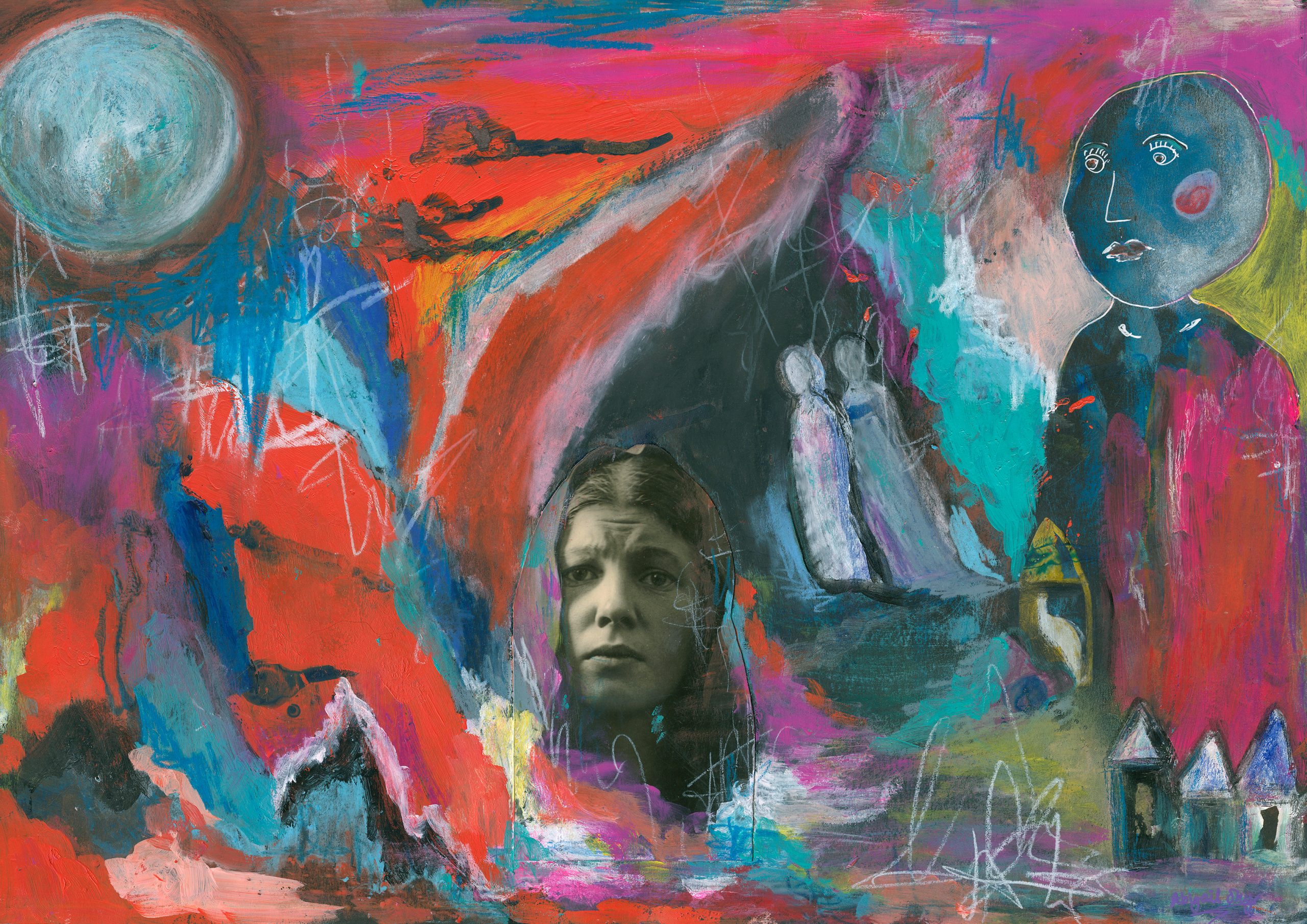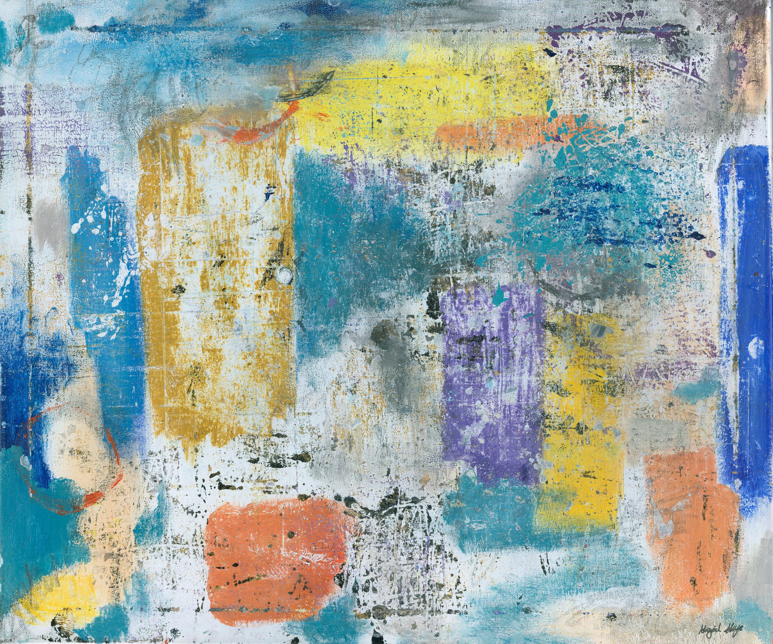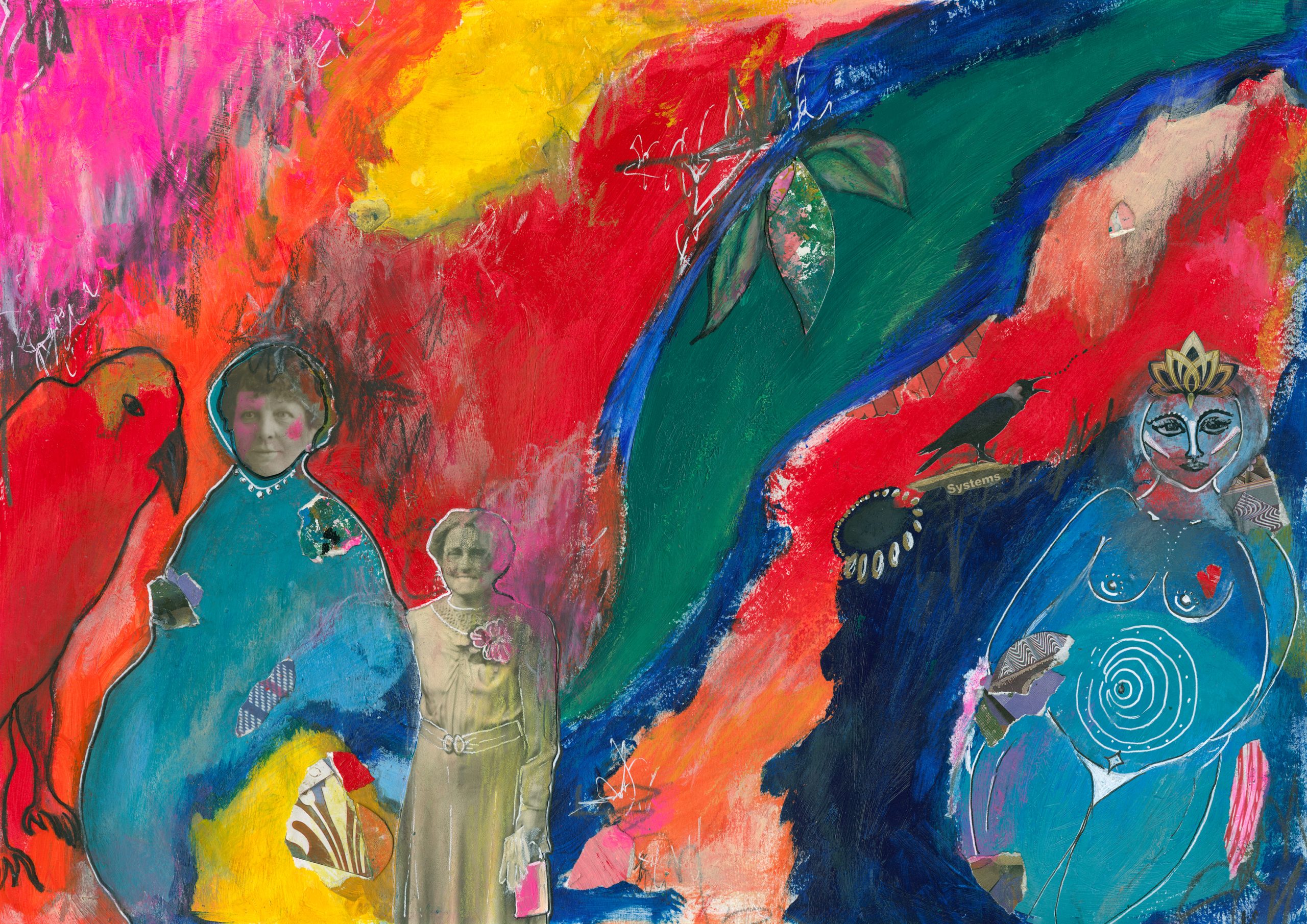 I work across canvas, paper, and art journals, using a wide range of materials and techniques. I also have a background in acting and facilitation, which continues to influence how I approach storytelling through image, texture, and movement. When I’m not in the studio, I recharge by spending time in nature, unwinding with my boys and our pet cat, playing music, or simply slowing down.