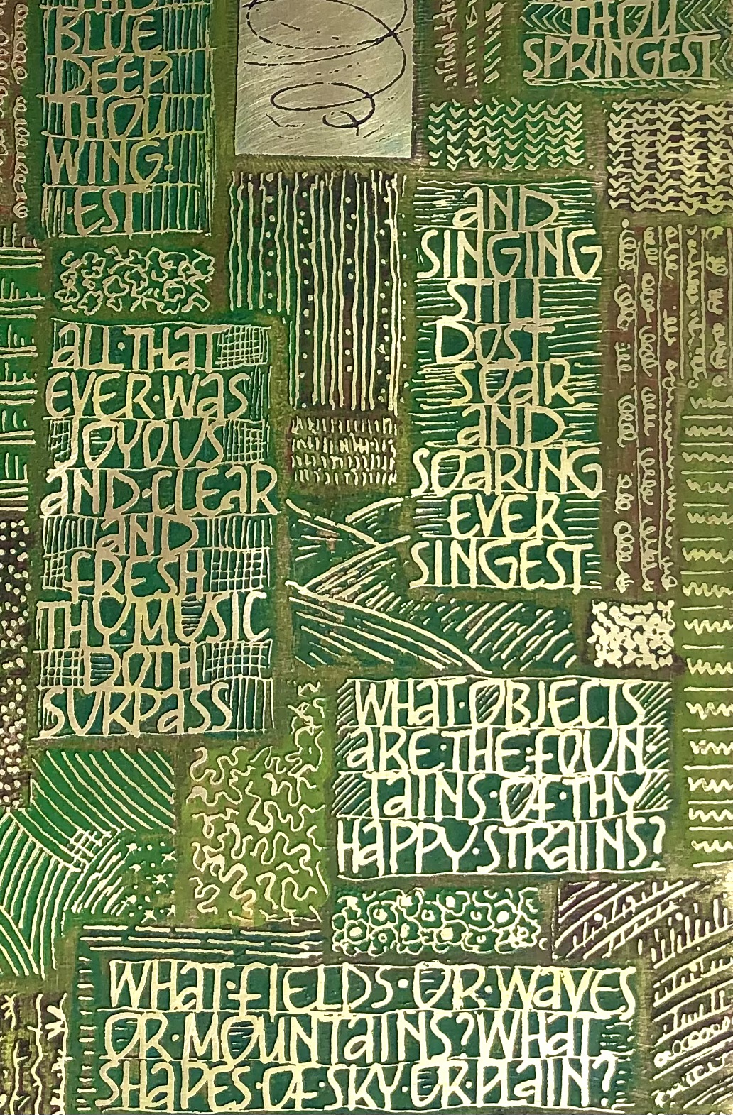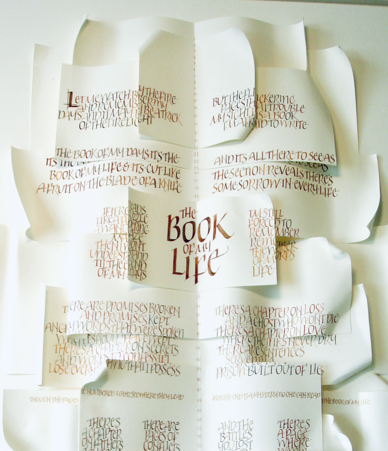 My formal calligraphy enriches my expressive lettering art which I exhibit. I have taught my techniques widely and many of my pieces are in private collections including US, Belgium and Japan. A former calligrapher in residence at V&A, I have a brass panel in their collection, developed from my studies there.